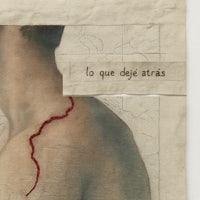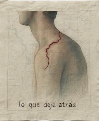 Esta pieza explora la memoria corporal como territorio de tránsito y pérdida. El cuerpo, representado de perfil y fragmentado, se convierte en un mapa en el que la distancia y el desplazamiento se inscriben físicamente. La línea bordada, en hilo rojo, recorre la piel como una herida o un río, señalando el rastro de aquello que se deja atrás en el proceso de migración o cambio.